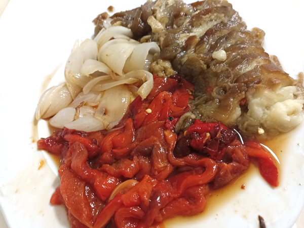 - Sacamos la verdura del horno. Retiramos la piel de la verdura, quitamos semillas y tallo y cortamos a tiras.