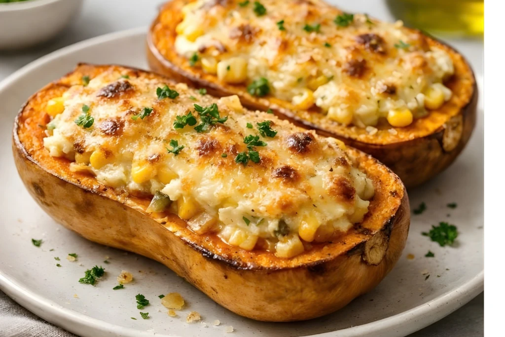 Calabaza rellena al horno gratinada con parmesano, maíz y ricota, servida en plato neutro con luz natural
